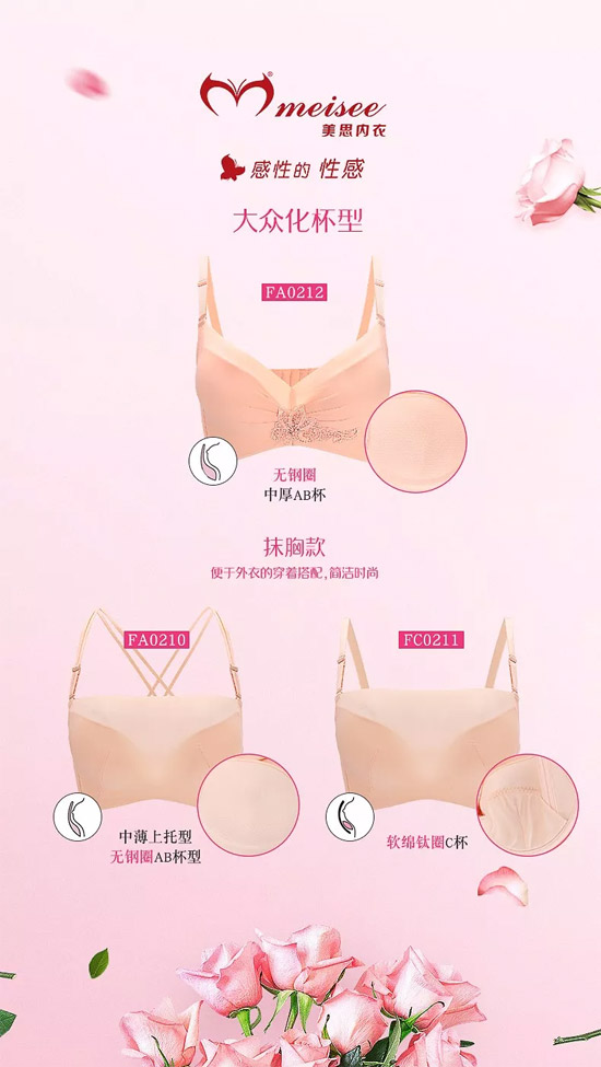 本系列产品打造性感美背组合,是美背款产品中更为舒适以及多样化的心动BRA,多种设计造型的肩带勾勒背部性感轮廓,抹胸以及小V设计让性感乳房若隐若现,迷人曲线叫人着迷。层层结合,仿佛一经触动,便迷醉此生。
