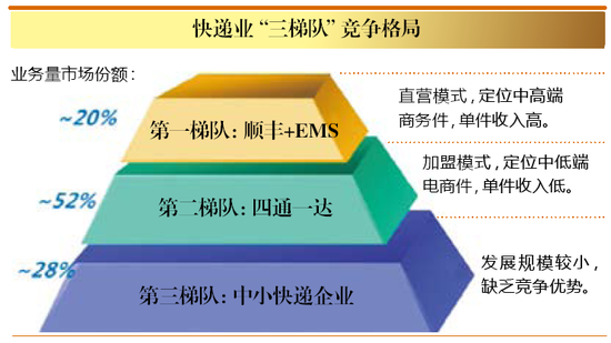 为何出现这种情况?数据显示,快递行业约80%的件量来自于电商件,20%为商务件。“通达系”主要做电商件,顺丰和EMS主要做商务件。从这个维度去比较,顺丰在快递单量上落后于“通达系”等同行也就可以理解了。