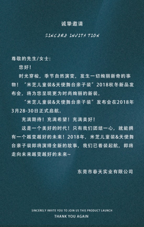 春天来了,冰雪融化,新的一年开始了,我们东莞春天实业有限公司将带给您一切全新的视野!此次米芝儿童装&天使舞台亲子装2018秋冬新品发布会,将带给您和宝宝们带来更为时尚新潮的新装。