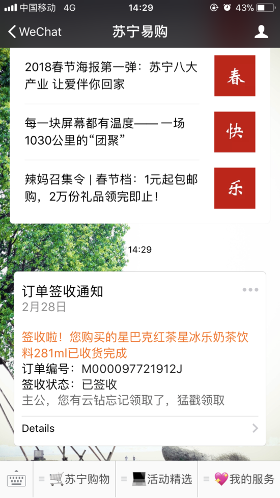 消费者完成消费后,相关购物费用及商品购买的通知将以短信和微信公众号信息的方式发送。