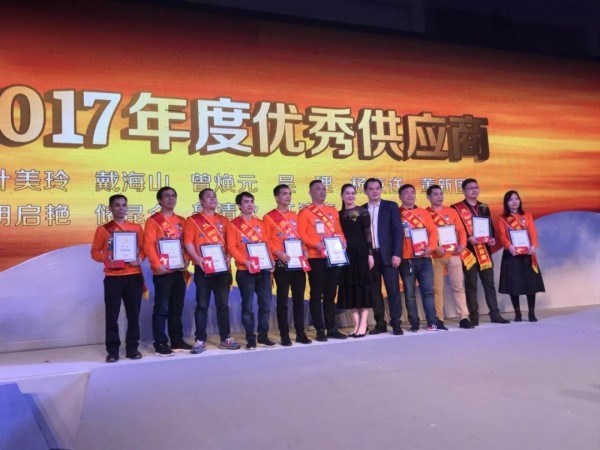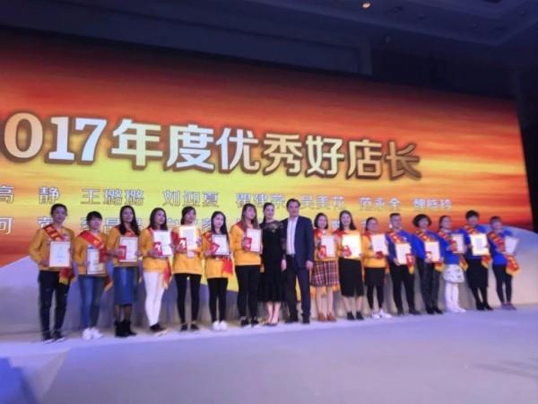 男生女生董事长柯文化先生和总经理柯明治女士为17年最佳杰出贡献奖、业绩成长奖、优秀好店长、优秀供应商颁发了四个奖项。