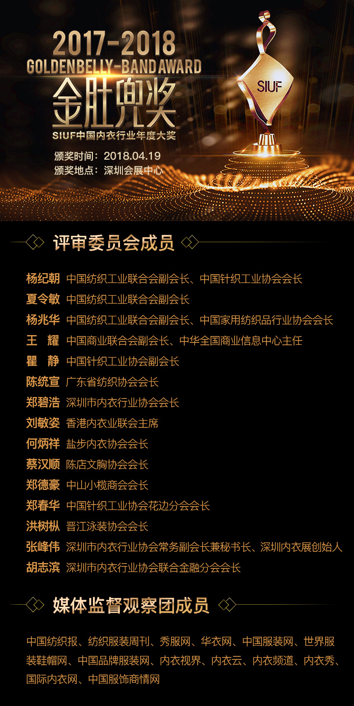 “金肚兜奖——SIUF′中国内衣行业年度大奖”评选暨颁奖活动是由中国内衣文化周组委会、中国(深圳)国际品牌内衣展组委会重磅推出的年度评选活动,旨在推动中国自主内衣品牌发展,激励现有品牌的提升和新生品牌的诞生,通过选拔优秀品牌树立行业标杆,引导行业持续健康发展,进而扩大中国内衣品牌的社会知名度和影响力。