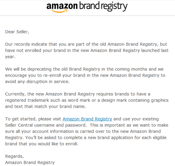 邮件大意为:“根据记录显示,该卖家是旧亚马逊品牌注册中心的一部分,但未在去年推出的新亚马逊品牌注册中注册品牌。亚马逊将在未来几个月内弃用旧的品牌注册中心,并鼓励卖家在新的亚马逊品牌注册中重新注册品牌,以避免服务中断。目前,新的亚马逊品牌注册要求品牌拥有注册商标,如文字商标或包含与卖家的品牌名称相匹配的图形商标。”