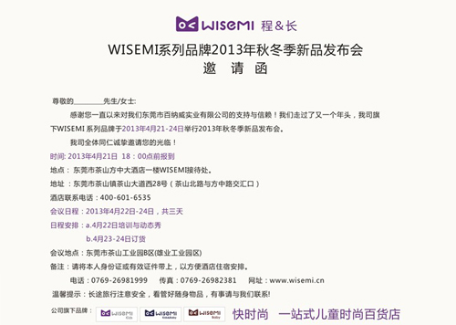 香港雄业集团东莞市百纳威实业有限公司旗下童装品牌“WISEMI”将于2013年4月21日至24日在东莞市茶山镇方中酒店隆重召开2013年秋冬新品发布会暨订货会,“程&长”在即,欢迎全国各地的新老客户莅临指导!