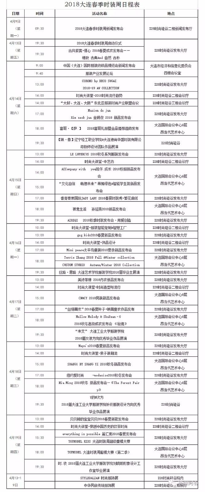 大连春季时装周历经14届。2018大连春季时装周将于4月13日至19日举行,历时7天。本届时装周由大连市经济和信息化委员会主办,大连市服装纺织协会承办,大连市服装设计师协会、韩国大邱庆北服装产业协同组合、日本大阪关西时尚协同组合共同协办。