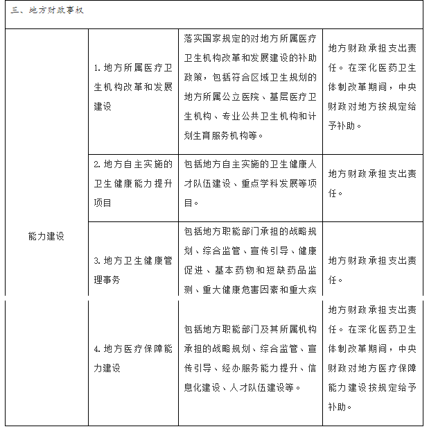 1.医疗卫生机构改革和发展建设。国家对医疗卫生机构改革和发展建设的补助,按照隶属关系分别明确为中央财政事权或地方财政事权,由同级财政承担支出责任。符合区域卫生规划的中央所属医疗卫生机构改革和发展建设明确为中央财政事权,由中央财政承担支出责任;中央所属医疗卫生机构承担地方政府委托的公共卫生、紧急救治、援外、支农、支边等任务的,由地方财政给予合理补助。符合区域卫生规划的地方所属医疗卫生机构改革和发展建设明确为地方财政事权,由地方财政承担支出责任;地方所属医疗卫生机构承担中央财政事权任务的,由中央财政给予合理补助。在深化医药卫生体制改革期间,中央财政对地方推进公立医院综合改革、实施国家基本药物制度、提升困难地区服务能力等按规定给予补助。加大对社会力量办医的支持力度,中央财政和地方财政按照规定落实对社会力量办医的补助政策。