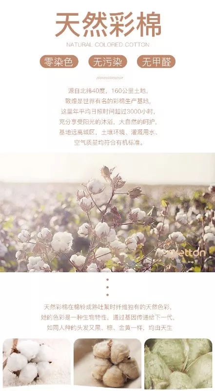 天然彩色棉的环保特性和天然色泽非常符合现代人生活的品味需求,它未经任何染色和化学工艺处理,符合清洁生产的要求,体现其回归自然的感觉,产品色泽柔和、自然、典雅,风格上以休闲为主,服饰品形象体现庄重大方又不失轻松自然,家纺类形象体现温馨舒适而又给人以反璞归真的感受。