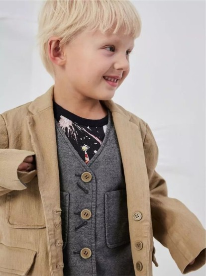 亚麻衣服强度高,耐腐蚀性好,易于吸汗和散湿。但是休闲又容易起皱的亚麻如何变得具有礼服感?设计师将亚麻制成西装版式,搭配可拆卸弹力小马甲,轻巧的礼服感轻轻松松就呈现出来了。