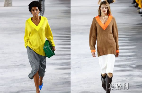 鸡心领的针织衫,选搭半裙是很好的选搭组合,色调选择:黄色和深灰,橘黄拼色领口和白色选搭。