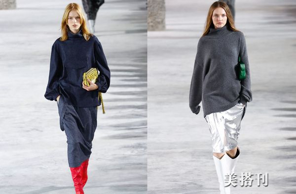 圆领针织衫的造型适用更广泛些,选搭半裙整体造型舒适,深蓝色调可以尝试红色鞋子,灰色上衣选搭白色裙装和鞋子。