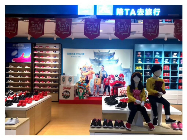 巨幅的亲子海报彰显着这家小猪班纳轻鞋誌的亲子旅行概念。整齐排列的鞋子用红黑色的经典配色搭配出亲子感觉。整齐的货架摆满了各种的色彩的服饰,这里简直就是孩子的乐园,充满了温馨的气氛。