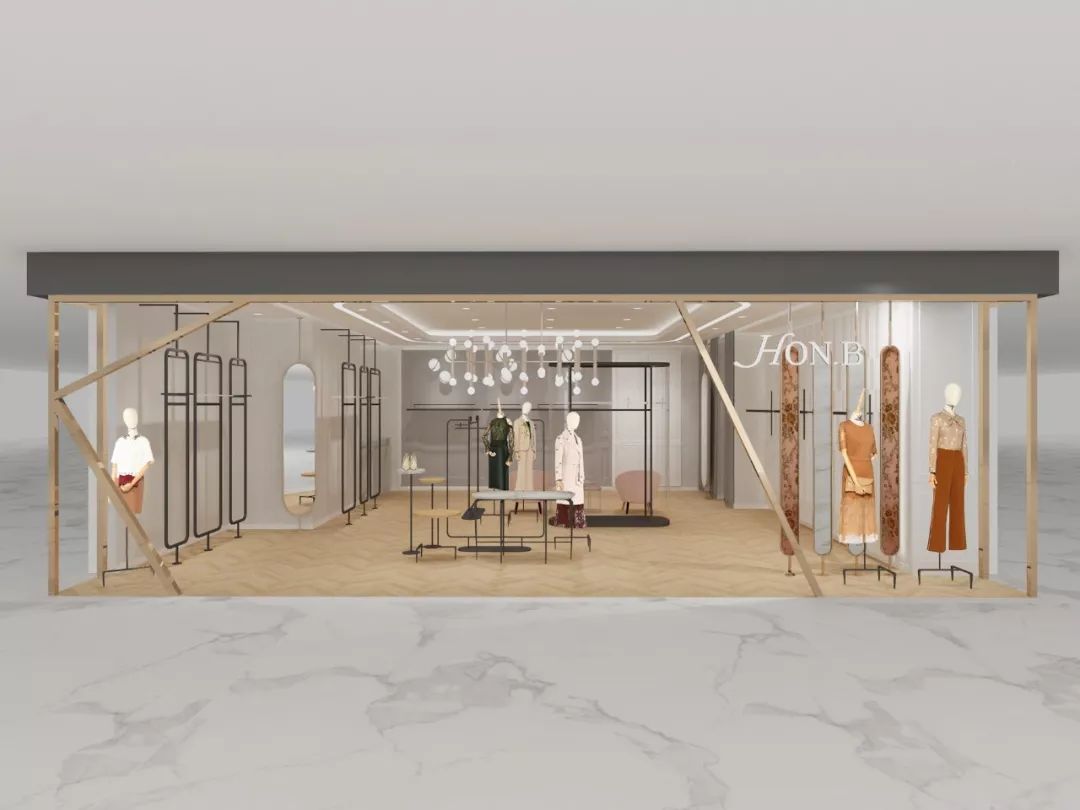 HON.B红贝缇女装用极为细腻的精致线条打造出简约不失格调的艺术空间,以舒适的驼灰色为主基调,华丽香槟金作为点缀,营造出轻奢典雅的购物环境。