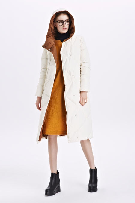 白色墨曲羽绒服在冬季非常受欢迎,而长款的设计更是凸显美好曲线。白色羽绒服内搭黄色裙装,优雅又不失高贵,十分适合职业女性或者日常出勤。再穿上黑色皮鞋,显出良好气质。