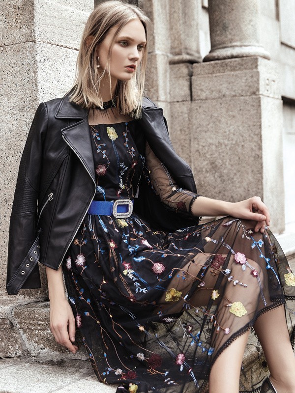 这一件仙气十足的连衣裙或许也是很多姑娘们都喜欢的哦。黑色的裙装和网纱刺绣搭配起来,带来满满的仙气感。外搭一件黑色的皮衣也是让你酷帅感十足呢。