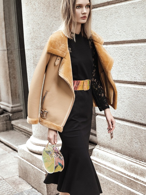 黑色的连衣裙带给人神秘性感的感觉。赫梵茜这一件黑色的连衣裙用一条金色的腰带点缀出时尚感,也很恰当的体现出腰线,非常的显瘦。搭配一件温暖的咖色短款外套,精致的做工和高级的面料毫无疑问会让你成为最耀眼的那一个。