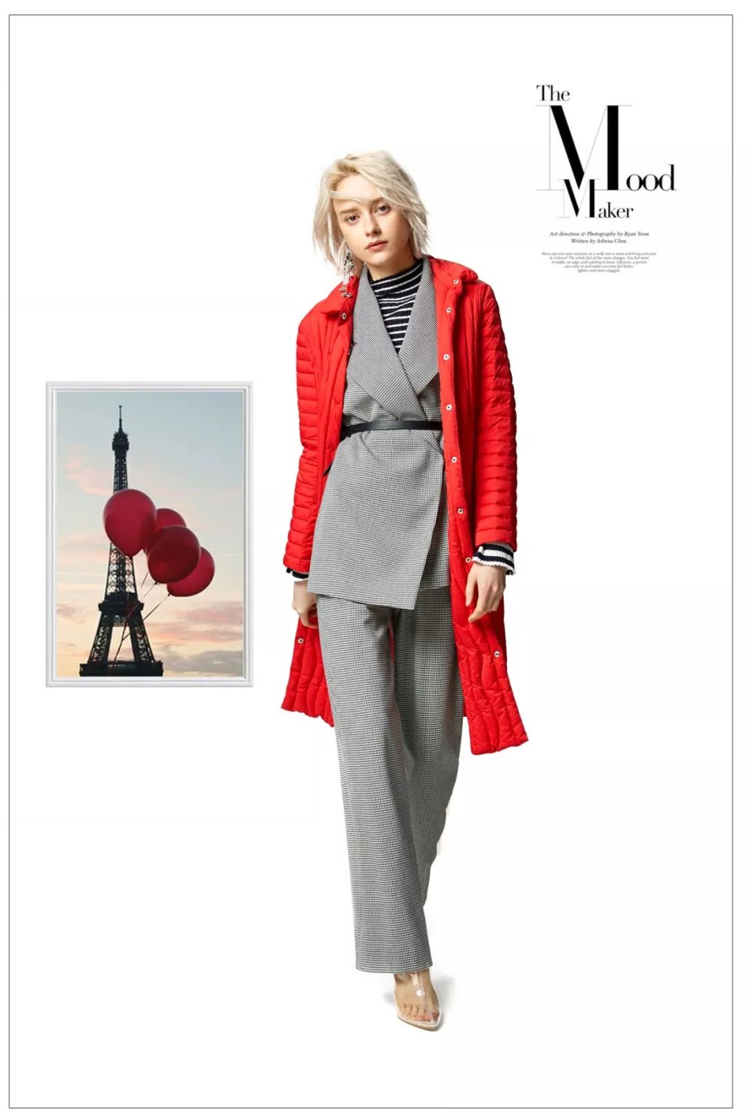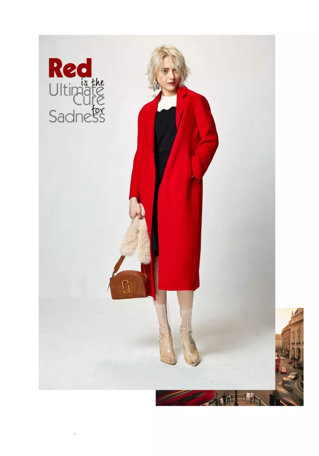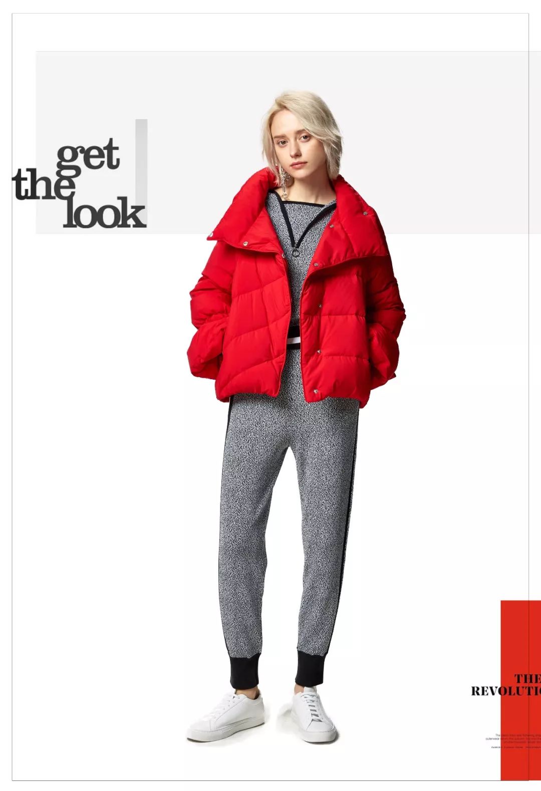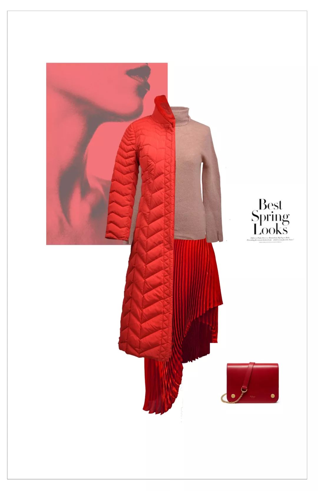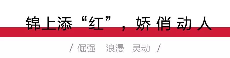 红色 需要大片空间来显示它的华丽,但同时红色又是极具膨胀感的颜色,所以大范围红色运用在穿衣搭配中,需要营造小范围的空间感。长款红色羽绒服,内搭半裙,适当的留白更加错落有致。托起好心情的LOOK,通身释放满满的活力。
