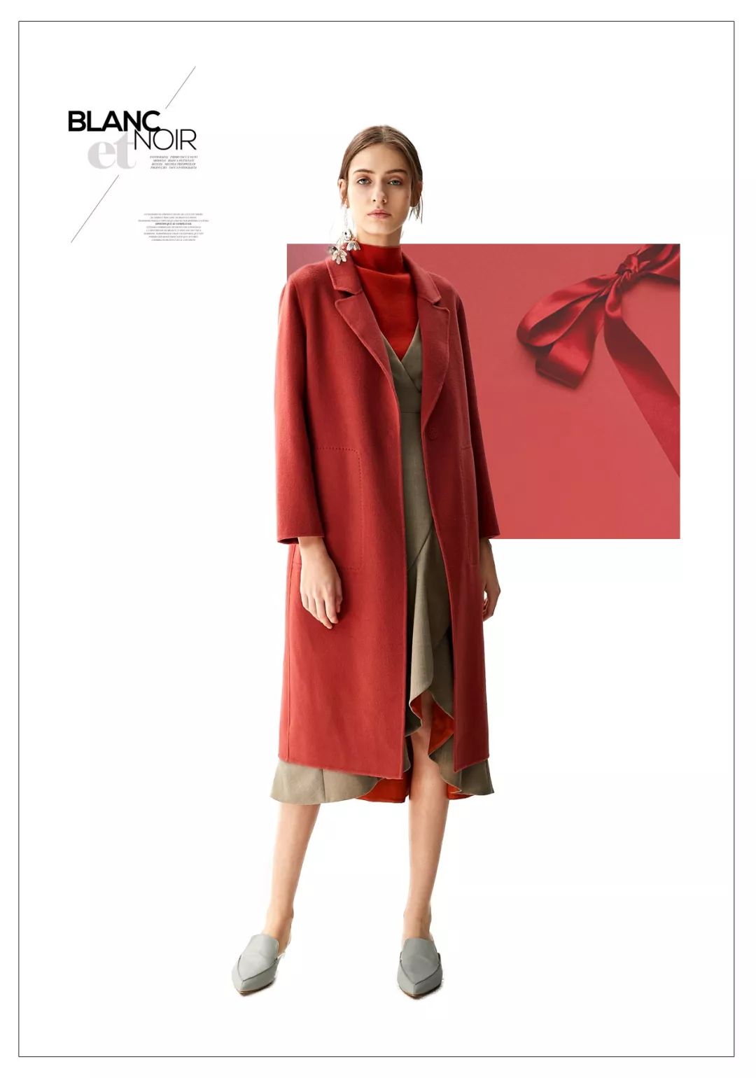 浓郁的深红色。浓烈但不明艳,深邃但不暗沉。少了张扬的分子,多了高贵端庄的质感。穿在身上既衬肤色,又不会过于老气。精选优等双面毛呢材质,打造高贵的垂坠感。温润的色泽最适合复古风,如果不喜欢对比色的冲突感,又害怕大面积顺色产生沉闷。就用浅色系连衣裙做内搭,打造女神style。