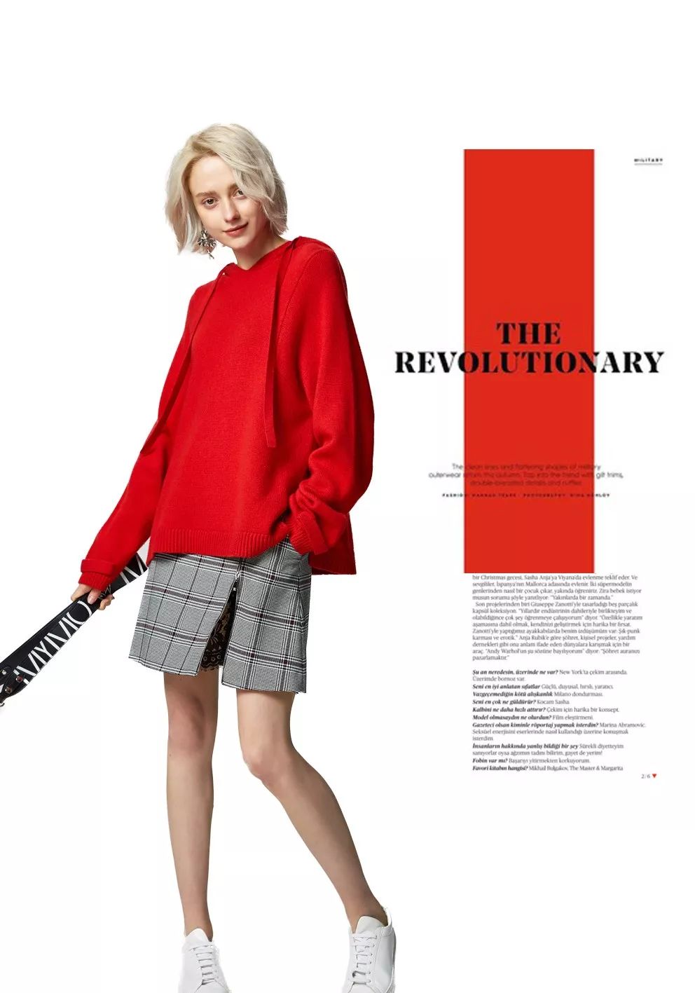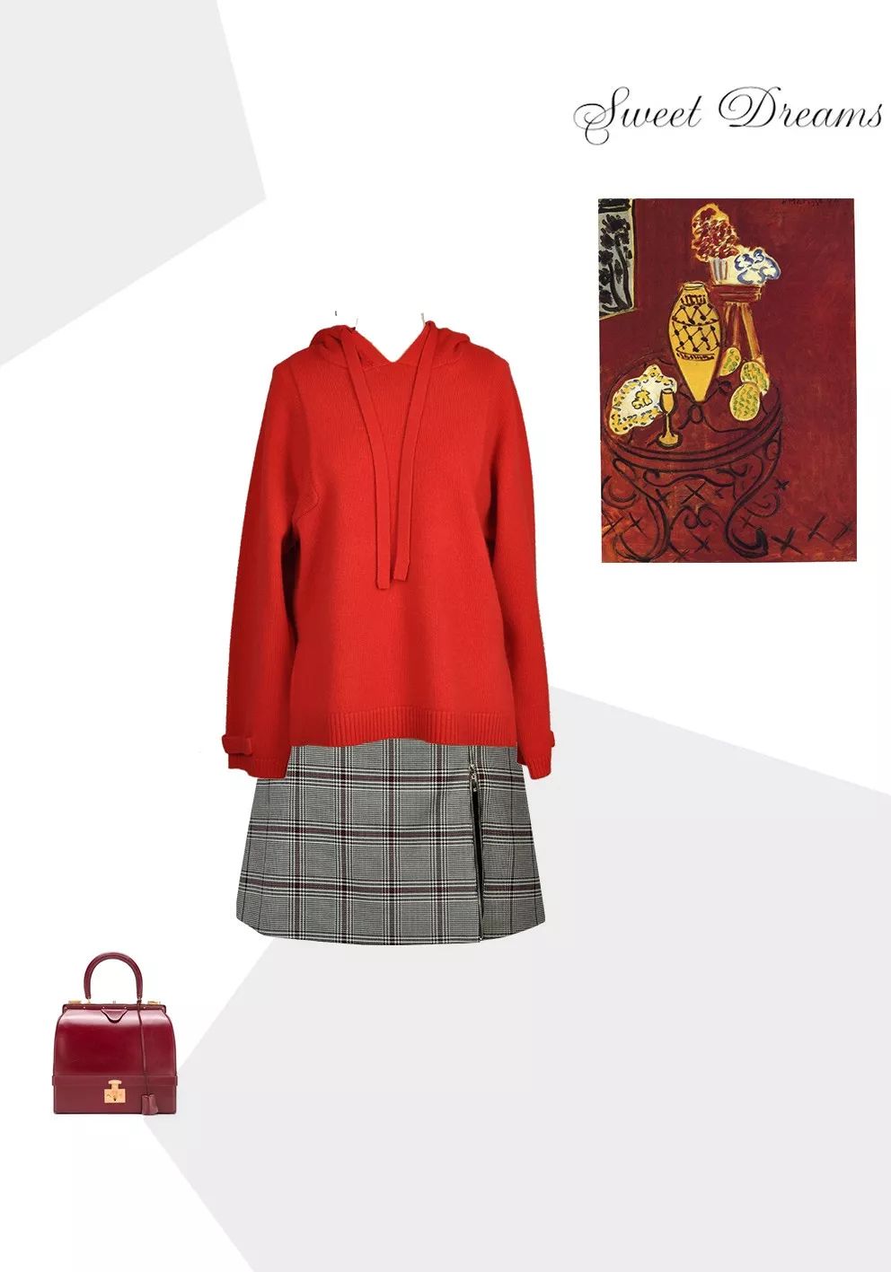 卫衣的轮廓,毛衣的质感,巧妙的设计更具年轻化的时髦。红色加持下,更是温暖的象征。为呼应红色毛衣的气场,选择一条造型感十足的格纹半裙。在视觉上吸睛、提升时髦度。妩媚又凌厉、酷劲又洒脱。