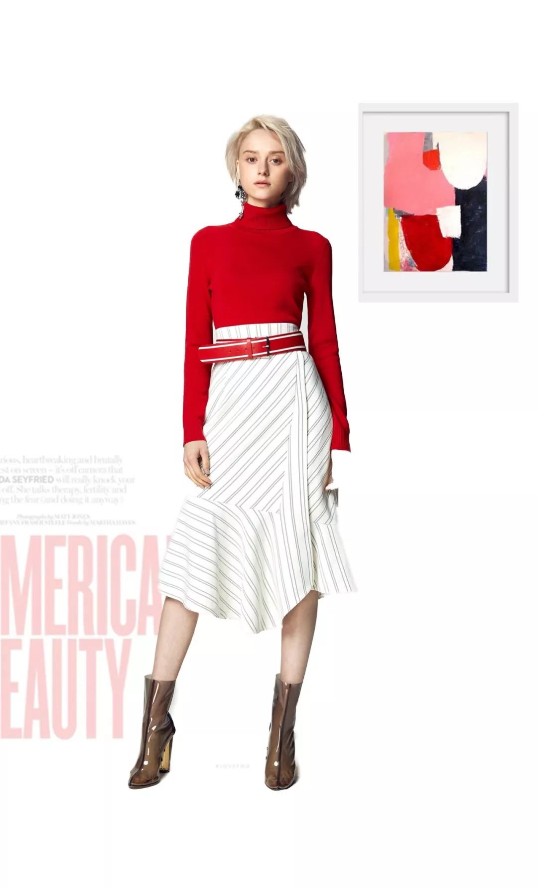 紧身的高领毛衣+半裙,打造优雅精致的时尚气质,凸显曼妙的身材。***不规则裙摆设计,为整体LOOK增添个性,修身毛衫的妩媚和条纹半裙的随性,互相组合映衬,碰撞别样的时尚层次感。在年会中作为内搭,不过分抢眼,却也不容忽视。
