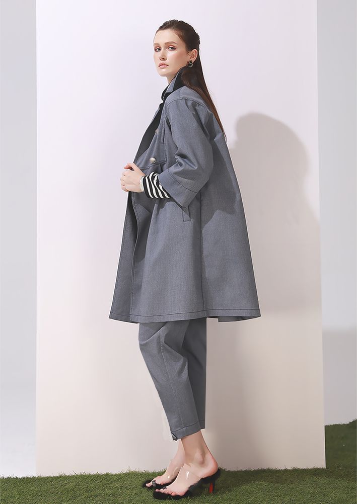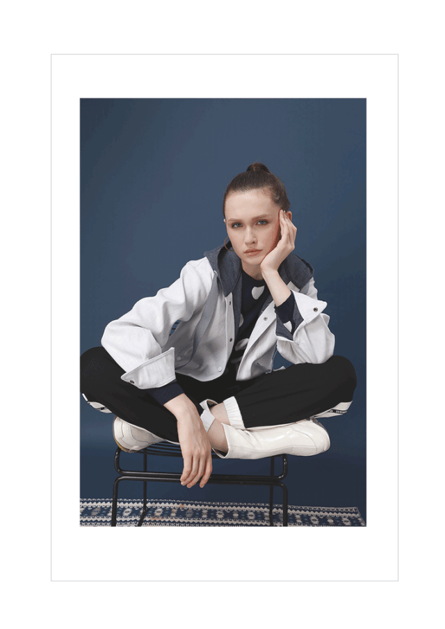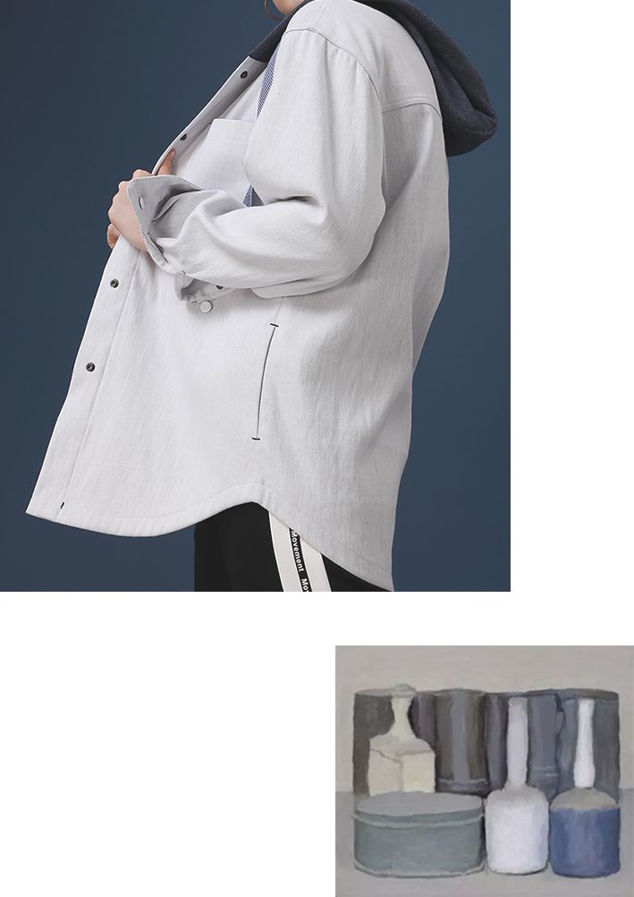定制的双色单宁面料,白色加以蓝色作为点缀,给人安静舒适的感觉。色彩看起来就像莫兰迪的画一样被蒙上一层淡淡的灰,有一种低饱和的灰色调。
