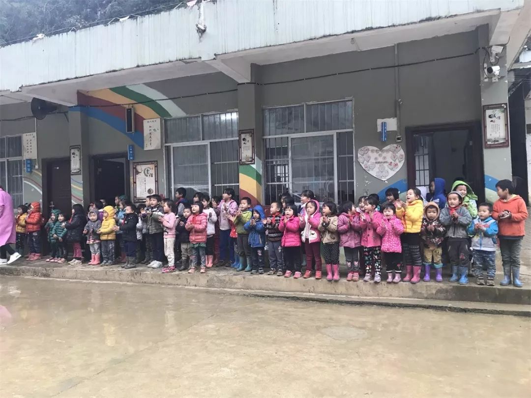距离小朋友们越来越近,眼睛看到的画面和耳朵听到的声音,当时的心情很难形容!天下着雨,老远就看见破旧屋檐下的一排排整理又娇小的身影还挥动着手势,同时一片整齐的声音一直回荡在山间和雨雾中:“欢迎~欢迎~热烈欢迎~”,平日里很难体会的那种鸡皮疙瘩,当时瞬间铺满了我的浑身上下!
