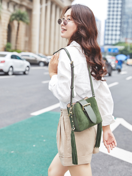 今年比较流行的绿色包包在设计上采用两边的流苏吊坠装饰让穿搭更加的飘逸灵动。宽扣带的设计也是凸显出了时尚大气感,这样简单又时尚的款式也比较百搭,快来给你的春节增添一抹时尚的绿色吧。