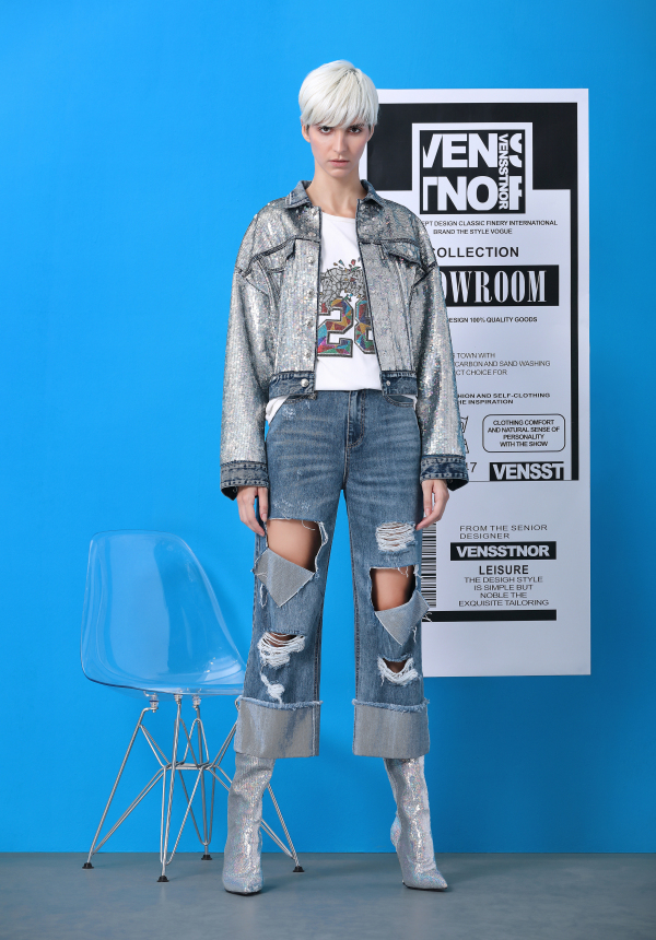 时尚又充满科技感的亮片牛仔外套不仅可以让穿搭更加的百搭好看,更是能够时尚又吸睛呢。VENSSTNOR维斯提诺这里用白色的T恤搭配上破洞牛仔裤穿搭就可以让春日的时尚牢牢守护在身边了。