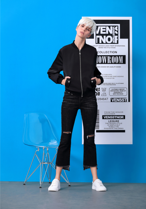 黑白色的搭配不论在什么季节都是非常的经典耐看。ENSSTNOR维斯提诺这里用一件运动风格的白色拉链上衣搭配上一条黑色的牛仔裤穿着,破洞加上微喇的款式让穿搭更能达到凸显出大长腿和修饰腿型的效果。