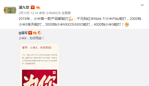 雷军表示,我们是为热爱而战,为工程师的技术信仰而战。这是小米基因中的追求,是小米工程师文化的天然秉性。归根结底,我们是为爱而战,为广大用户和米粉们的向往而战。所有的努力都是为了米粉的欢呼。小米9是我们奉上的最新信心之作,更是我们高昂斗志的展现。