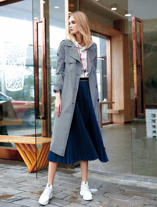 时尚的黑白格子外套用翻领款式让穿搭凸显出几分职场味道,内搭一件连帽卫衣彰显出几分青春时尚感,下面一条丝绒百褶裙的搭配也是将混搭穿出了时尚感,同时也是非常的青春时尚哟。