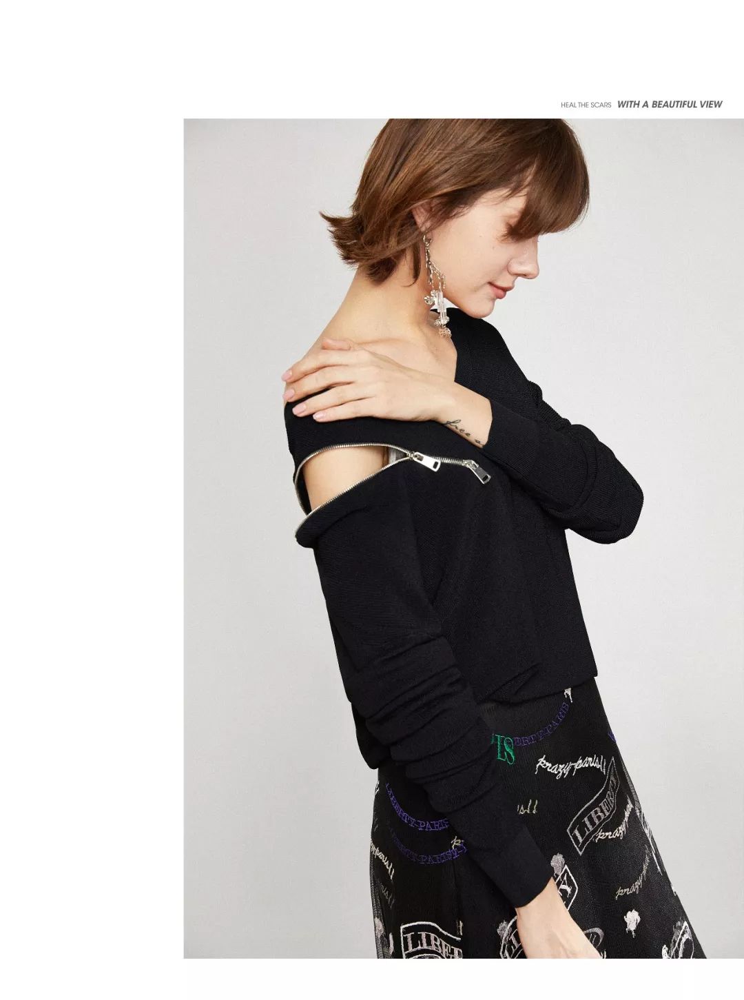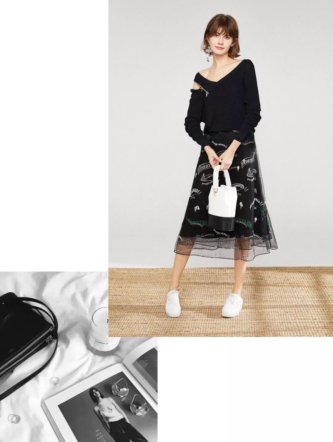 有趣的可开合肩部设计,让黑色针织衫性感活泼又个性十足。大V领加持下,透着精致的女人味。轻薄飘逸的黑色网底绣亮色标语刺绣,层次感的结构里藏着青春气息。