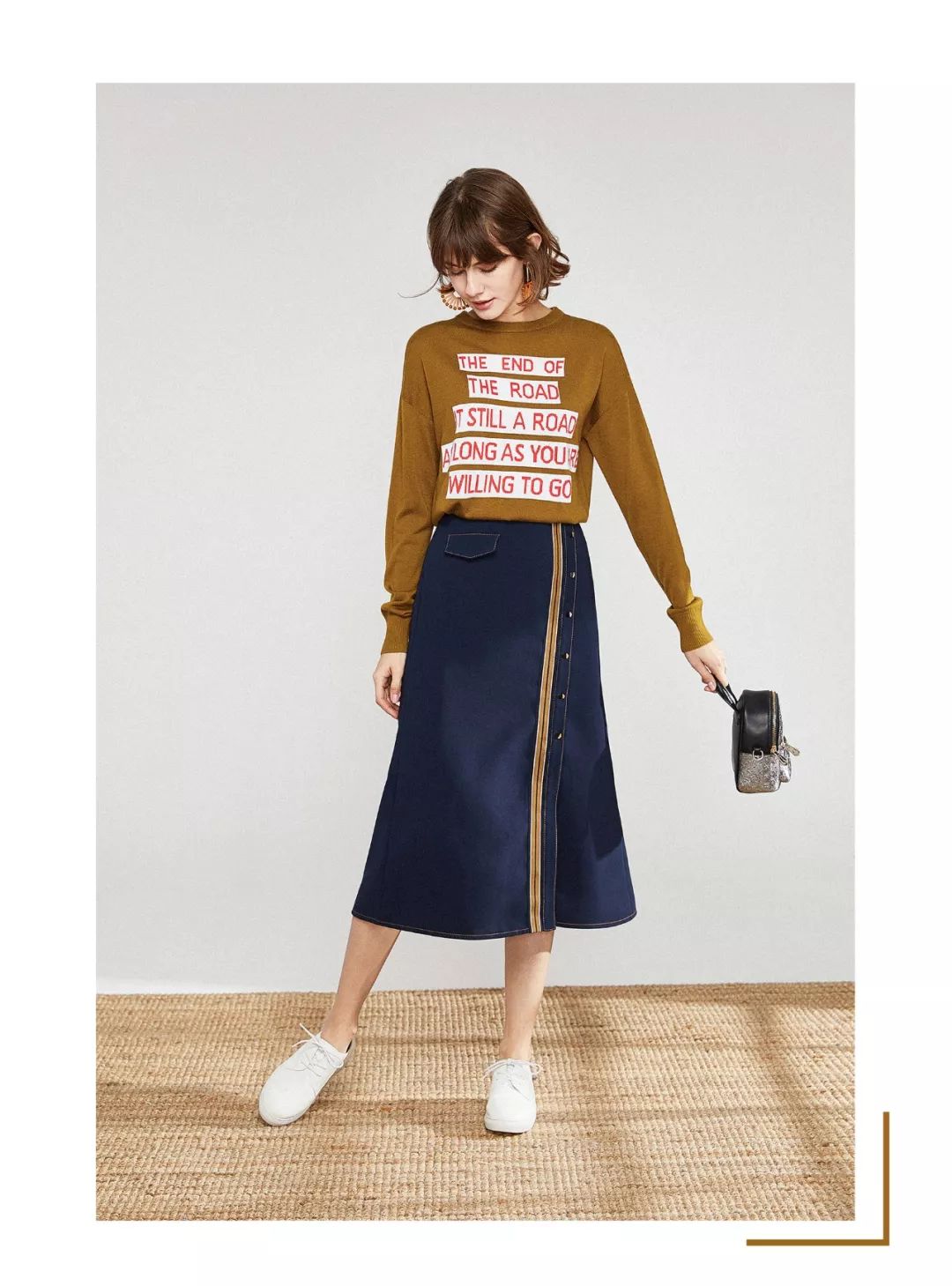 橄榄绿针织衫上,融入醒目撞色的Slogan标语,让基础款单品跳脱平庸,复古时髦又彰显个性态度。搭配侧开衩半裙,拼接橄榄绿织带的运动细节,呼应针织衫的颜色更显统一,同时更彰显青春活力。整体体现女性俏皮乐观的生活态度。