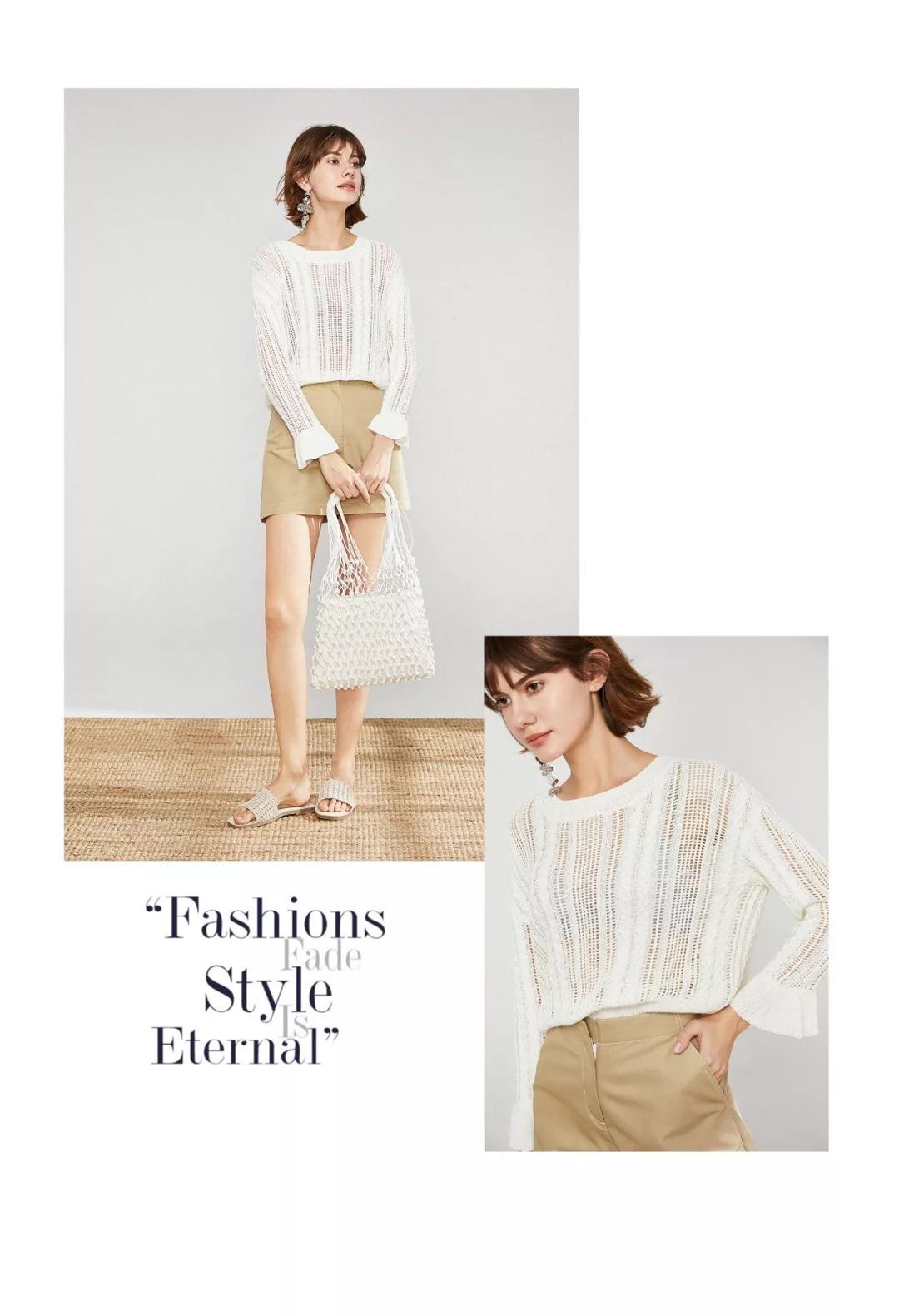 透视的针织上衣极具女人味,简单又有设计感。张弛有度的缝隙,隐约透着魅惑,不媚俗点到为止,袖口可爱喇叭袖,甜美极了。搭配挺括的卡其色短裤,简洁利落的廓形与毛衫碰撞出女性的浪漫新趣,视觉慵懒又休闲随性。