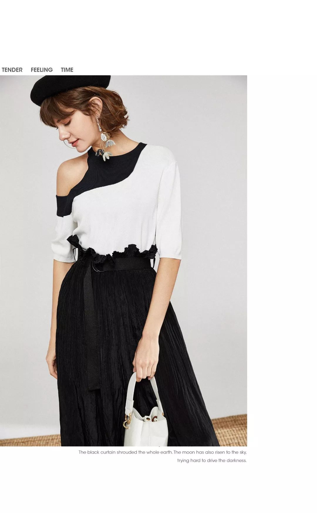 谁会想到一件针织衫,肩部也有“风光无限”的一面。今年流行choker肩部挖空针织毛衫,黑白巧妙的拼接融合在一起,浓郁的艺术感。暖春露肩的***选择。内搭高腰黑色半裙,温暖的风情,营造“毫不费力”的时尚。