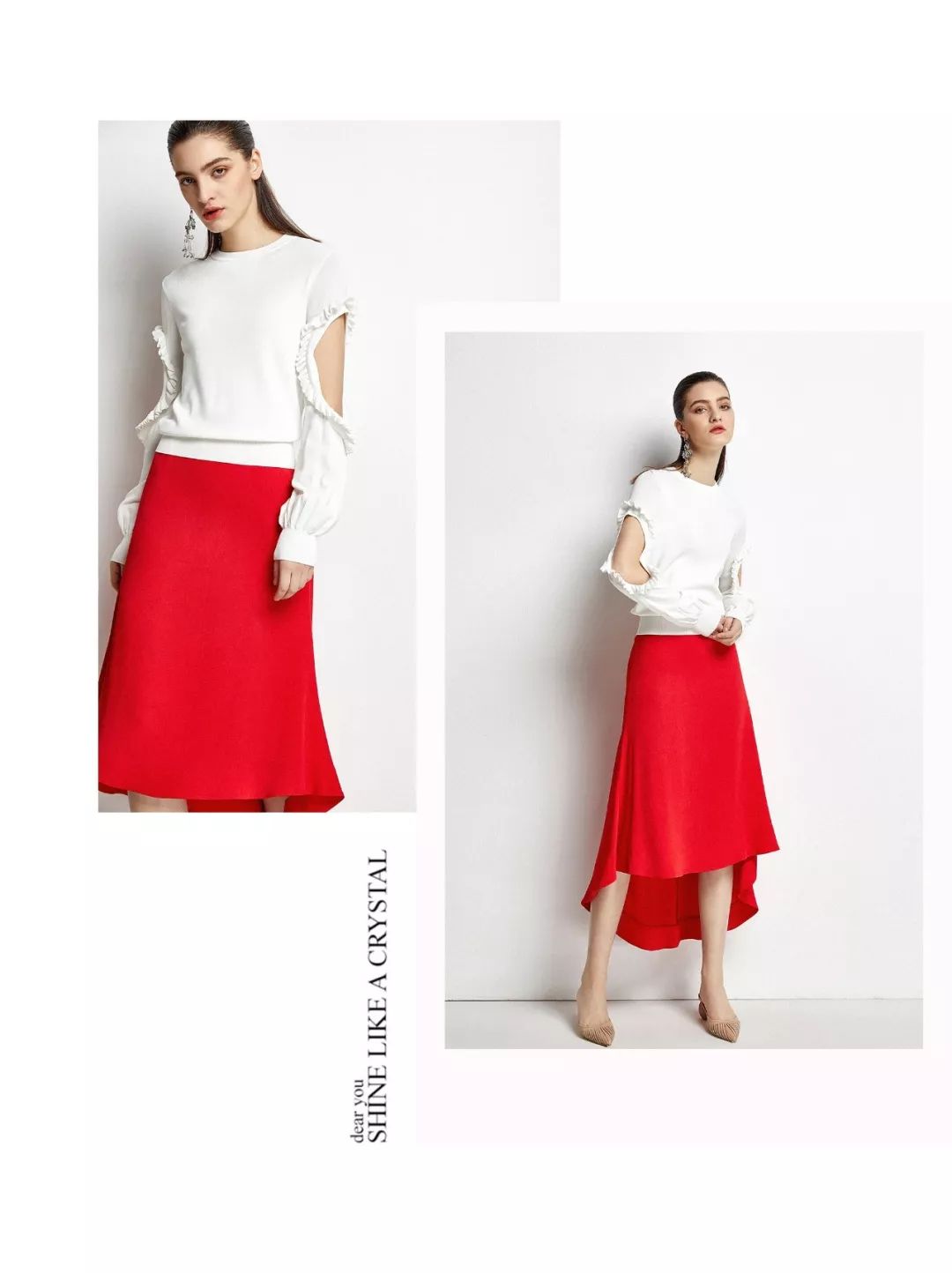 为了让上半身看起来比例更好,我们要注意针织套装的版型选择,上衣一个个性张扬的拼接吊带,将视觉集中在上半身,从而达到显高的效果。大方简单、织法紧密显瘦效果很好,红色复古袖口点缀,更吸睛。针织半裙营造摇曳生姿的曼妙。