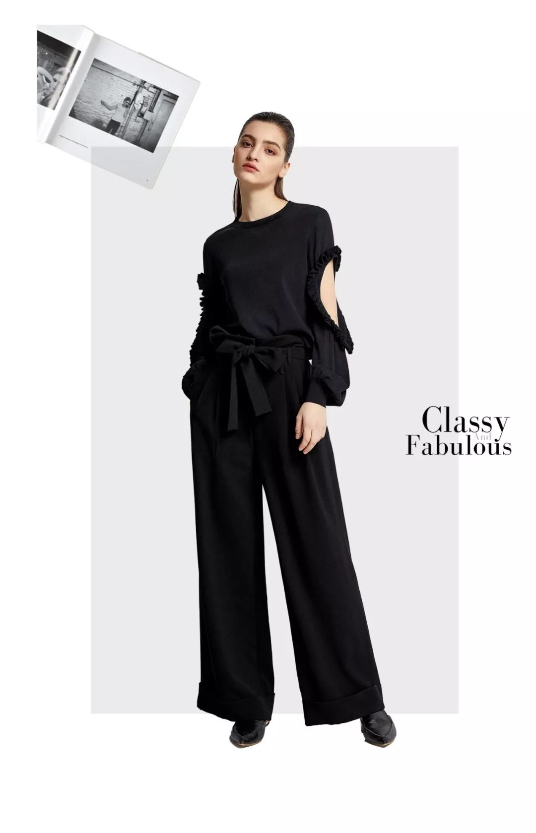 在人想不到的地方煞费苦心,胳膊处挖空拼接荷叶边,营造出奇制胜的细节。搭配黑色阔腿裤,同色系搭配更显极简的高级感。