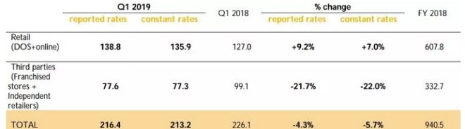 皮具和配饰部门销售额下跌6.9%至2760万欧元,按固定汇率计算减少9.7%至2670万欧元;
