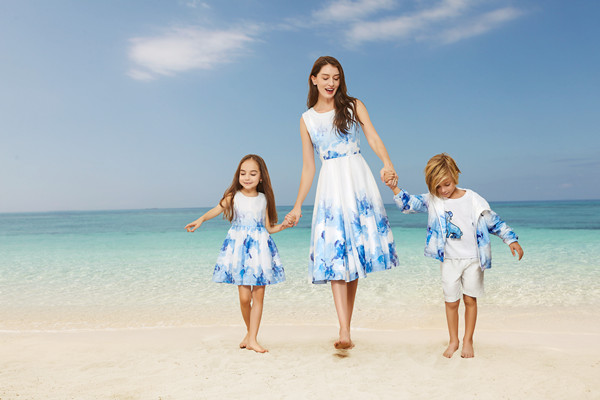 优雅的仙女风宝妈们也许会更喜欢这一系列,白色裙身映衬着扎染水墨蓝元素,浓淡相宜、层次分明,蓝色晕染出花朵般的造型,更显优雅与精致。这一元素穿在宝妈身上大气有范,穿在萌娃身上也不失俏皮。