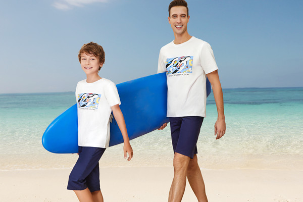 海边度假,热爱运动的男孩子怎能不冲浪呢?与爸爸一起换上休闲舒适的T恤短裤套装,活力十足地迎接海浪吧!