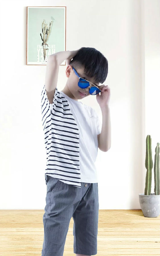 条纹拼接韩版T,搭配修身细条纹中裤,帅气又时尚。