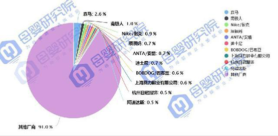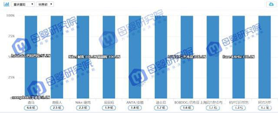 一直保持第一名的巴拉巴拉,其在天猫和淘宝的比重差距不算大,整体来看,TOP10品牌中,在天猫的比重要远高于淘宝。以安踏为例,在天猫占比96.6%。但是TOP10中也有一家纯粹的“淘品牌”——辰辰妈,全部销售额都在淘宝,依靠淘宝平台获得线上销售额第四名的位置。