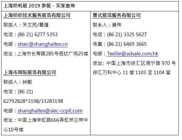 「shanghaitex 2019上海纺机展」将于2019年11月25-28日于上海新国际博览中心(浦东)盛大举行。本届以「智汇纺织‧跨出更好生活」为主题,将承传以往佳绩,于传统纺机展的成功基础上,汇聚全球纺织业内顶尖科技;本年展会更将重点推出同期活动“textech galaxy纺科银河”,其中聚焦三大纺织时尚新星:人工智能、可穿戴技术及初创企业,透过展示、论坛、比赛和商贸配对等探索前沿创新技术,为纺织、时尚与科技行业搭建桥梁,共同开拓纺织的无限可能,启发未来。
