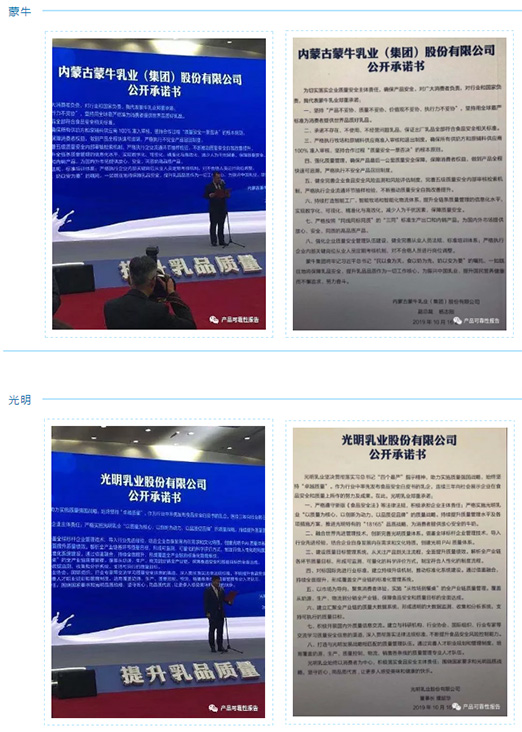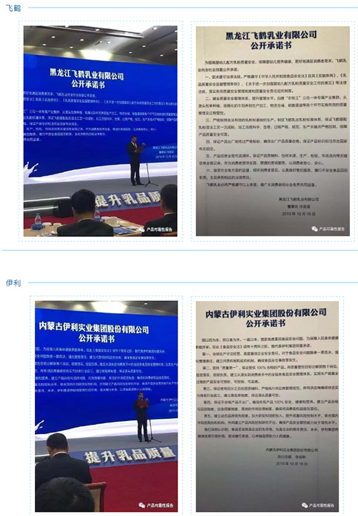 活动中,飞鹤、伊利、蒙牛、光明、君乐宝、三元、完达山、圣元、银桥、新希望、雀巢、美赞臣12家大型乳企负责人现场分别作出承诺,承诺以最严格的标准、最先进的技术、最规范的管理,生产出最优质的产品,落实企业质量安全主体责任。
