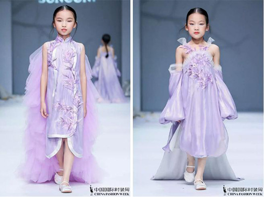 童梦记忆系列以灵魂动物为启发,蝴蝶,鲸鱼,海鸥等动物为图腾设计春夏礼服。让孩子们穿着中可以看到各种童趣细节和闪亮面料,由心快乐。每件设计都有灵魂动物的代表,海鸥代表自由,蝴蝶代表美梦,鲸鱼代表快乐。运用浅紫色、珊瑚粉等梦幻色彩,点缀于深沉的夜空颜色。配合灵动流苏装饰,表达童年对动物的亲昵好感,表达孩子内心的独到气质。款式上多有尝试非传统礼服的制版方法,让童装礼服不再是缩小版的成人服装,也是设计师想表达的独特态度:每个童年都是一场永不落幕的梦,每个孩子都有个性表达的力量。