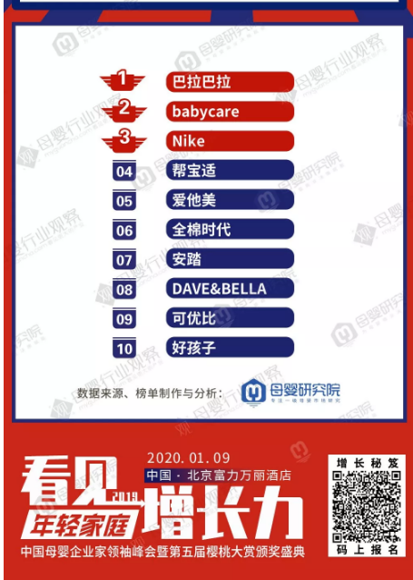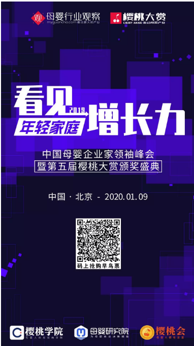 其余品牌相比去年有波动,但是基本在一个稳定的区间。在母婴行业中,童装是一个变化比较多的类目,但是在变化之中总有稳如泰山的品牌排在头部,也有的品牌稳步前进。正如整个母婴市场,在人口红利不断消失、经济下行重压下,母婴企业均面临着巨大的生存考验,而焦虑之下,依然有新的能量悄然生长。所以“前瞻力”很重要,“看见”很重要,在挑战中寻求新的增长力。2020年1月9日北京,由母婴行业观察主办的“看见·年轻家庭增长力!2019中国母婴企业家领袖峰会暨第五届樱桃大赏颁奖盛典”(点此☞申报奖项)重磅开启,我们将邀请最具实践经验、增长成效、深邃洞见,未来潜力的嘉宾,分享最鲜活的案例,碰撞最深刻的观点。来现场,与2000+母婴人,一起洞见年轻家庭增长力,极致增长2020!