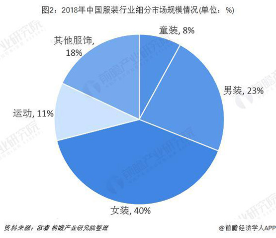 随着经济的发展,消费者的消费习惯趋于成熟,消费需求相应更加多元化、个性化,也由此形成了不同的细分市场。根据欧睿的调查数据显示,2018年,中国服装行业中,女装市场占比最大,达40%;其次是男装、运动、童装,2018年三者占比分别达23%、11%、8%。
