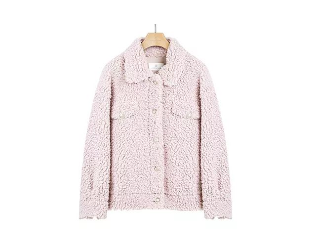 袖口处同样采用拼接粉色羊圈毛设计