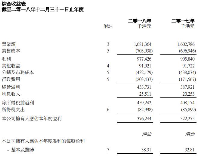 金利来2018年纯利同比增长16.75% 直接经营104间销售点