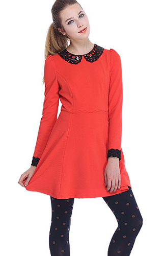 碧淑黛芙2013冬拼接长袖红色连身裙复古修身气质