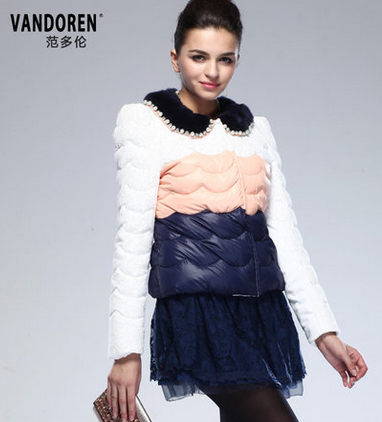 范多伦新女秋冬蕾丝兔毛领拼接翻领羽绒服外套